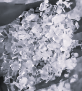 Representative examples of irregular polycarbonate regrind (left) and uniform pelletized material (right).
